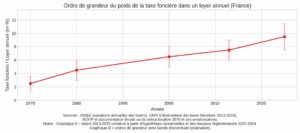 - 2013-2023 : Explosion de la taxe foncière : +32,9 % en 10 ans, contre seulement +7,7 % pour les loyers. Le poids de la taxe foncière par rapport au loyer a quasiment doublé sur cette période, le ratio TF/LOYER en % finissant par littéralement exploser.